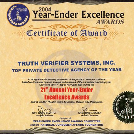 Award was given by Year-Ender Excellence Awards Committee and the National Consumer Affairs Foundation during the 21st Annual Year-Ender Excellence Awards Album navigationPreviousPrevious album:1999 – Best Private Detective AgencyNextNext album:TVSI AWARDS